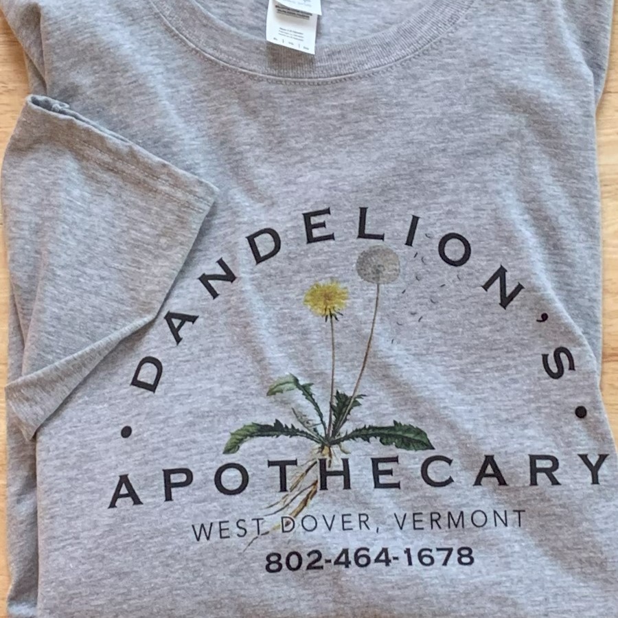 Long sleeve T shirt, gray with Dandelion’s Apothecary logo.